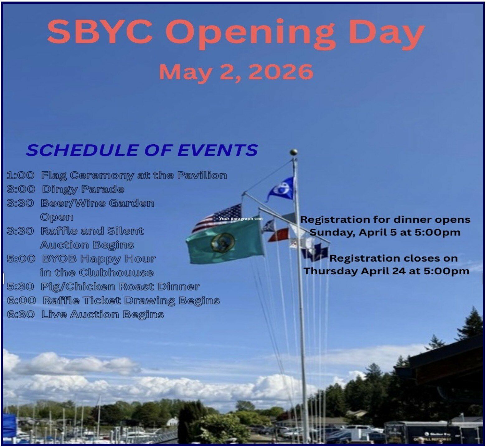 Our Opening Day Team has a BIG DAY planned for us this year! Following the traditional Flag Ceremony we'll be joining the Swinomish Yacht Club for their dinghy parade. We're bringing back the ever-popular Beer & Wine Garden. And for dinner, the crew will be roasting a pig during the afternoon festivities. Dinner will also include roasted chicken, plus a salad and potato bar provided by Gere-a-Deli.